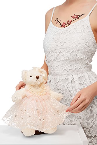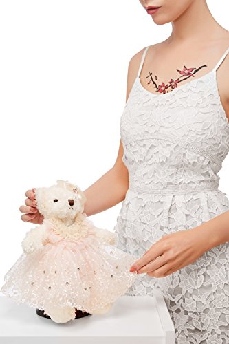 The soft toy bear is approx. 8" (20 cm) tall when sitting. With the dress spread out around the bride, the width and depth reach up to 16" (40 cm).