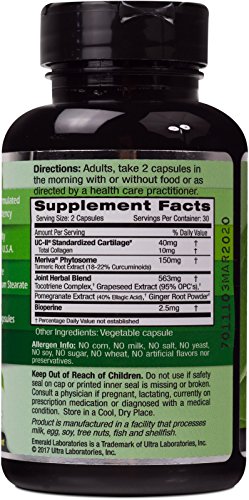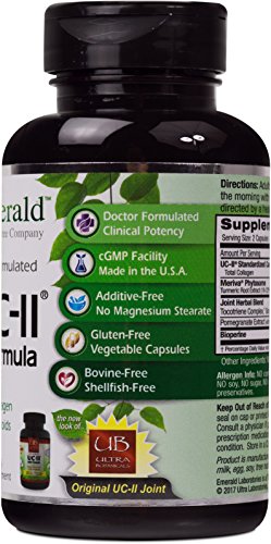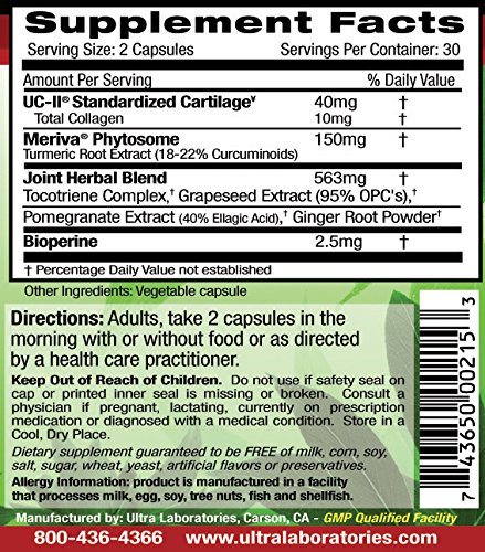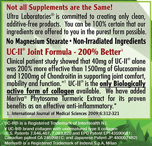 ReleaseDate : 2015-08-18 Studio : Ultra Laboratories Publisher : Ultra Laboratories Binding : Health and Beauty Product Description Human clinical studies indicate that 40mg of UC-II alone was 200% more effective than 1500mg of Glucosamine and 1200mg of Chondroitin in promoting joint flexibility and mobility. UC-II is the only Biologically active form of collagen available. We have added Meriva Phytosome Turmeric Extract for its proven benefits as an effective anti-inflammatory. UC-II Undenatured Collagen is the only Biologically Active form of Collagen available on the market. The patented process of the Undenatured Collagen is proven to retain collagen in its native undenatured form allowing to actively function in the body. Common forms of denatured collagen are not biologically active and are not the same. 0