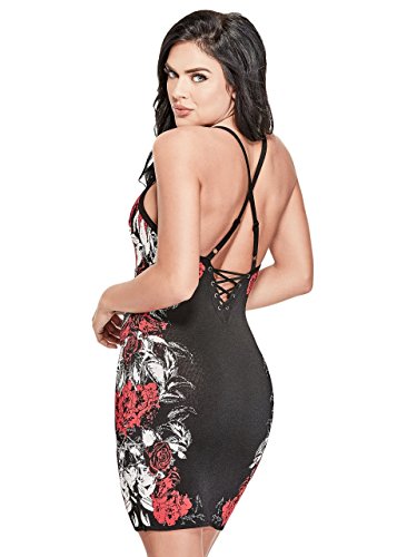 A sleeveless mini dress featuring a floral jacquard design, a strappy v-neck, a lace-up v-back design and body-hugging fit.