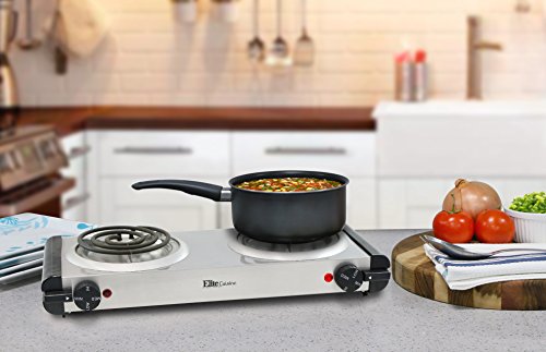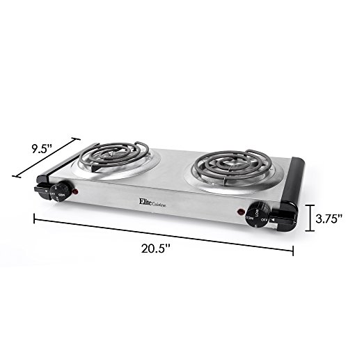 Create gourmet meals in a small space with this nonstick Elite cuisine electric double burner. The Stainless steel appliance has 7-inch and 6-inch elements with high, medium and low temperature settings for reliable results. This 1440W Elite cuisine electric double burner includes a hot surface indicator light for safe use.Feature