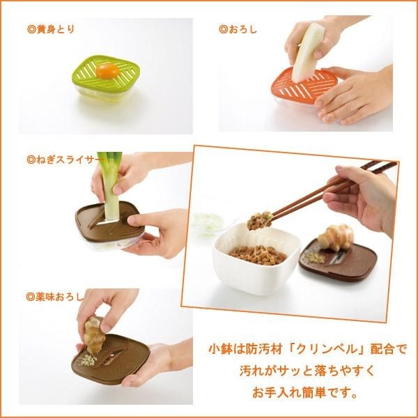 ねぎ、たまご、大根おろしなど、アレンジは自由自在です。納豆を10倍楽しむためのセットです。小鉢は防汚材「クリンベル」配合で汚れがサッと落ちやすく、お手入れ簡単です。 |