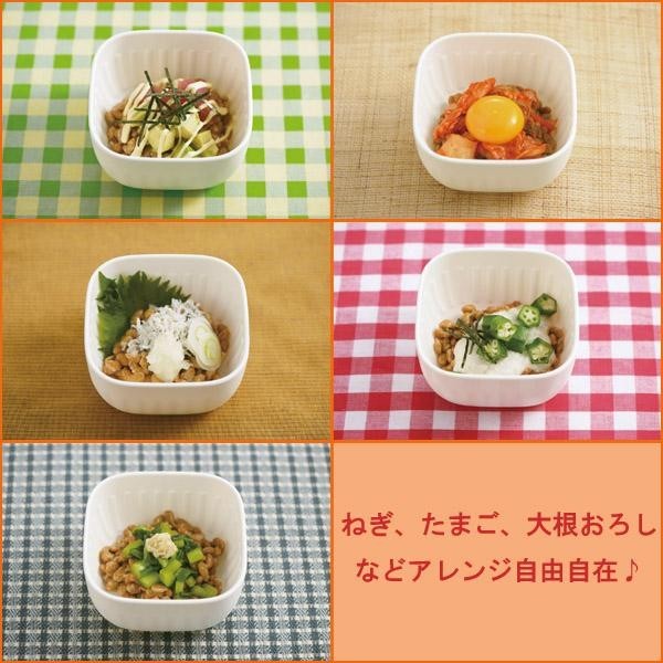 | ねぎ、たまご、大根おろしなど、アレンジは自由自在です。納豆を10倍楽しむためのセットです。小鉢は防汚材「クリンベル」配合で汚れがサッと落ちやすく、お手入れ簡単です。 |
