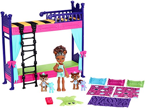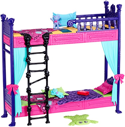 Monster High family doll packs help bring the ghouls' home lives to life. Get ready to climb into bed with the wolf family with this play set -- it includes Pawla Wolf doll (the younger sister of Clawdeen Wolf), two Wolf family were pups, a bunk bed set and accessories to help ensure sweet dreams. The bunk bed set is claw some designed in bright colors and with monsteriffic touches like a ladder with claws for feet and a curtain detail on the lower bunk bed. Pawla Wolf doll and her two smaller sibling figures are each dressed for bed in monster cute pajamas. And accessories, like blankets, a monster-shaped rug and teddy bears for the were pups keep these young werewolves over the moon!Feature