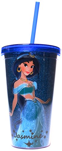 Silver Buffalo DP09087G Disney Princess Jasmine Glitter Plastic Cold Cup with Lid and Straw, 16-Ounces
