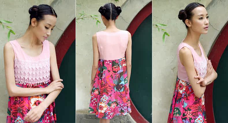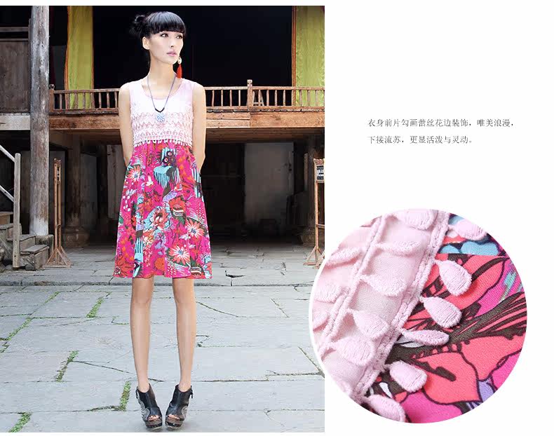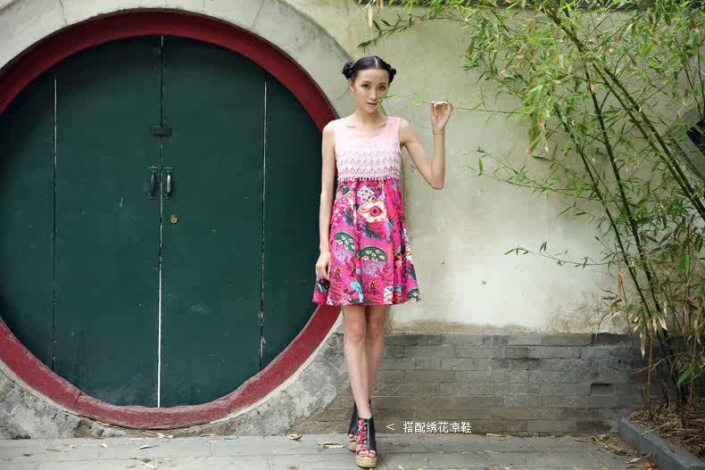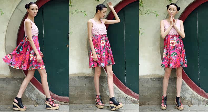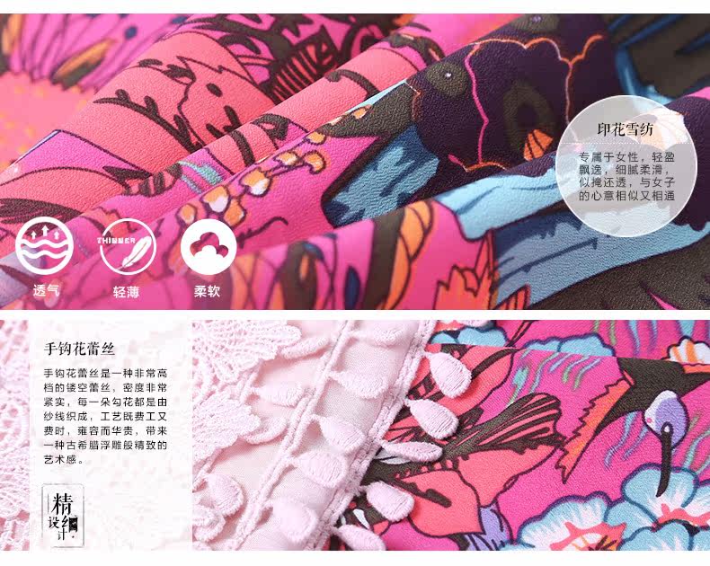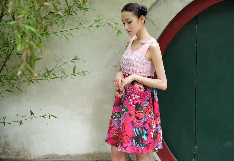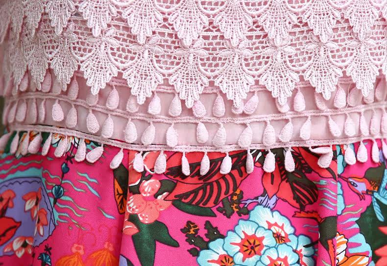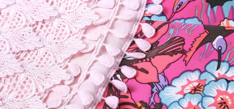 乳燕双飞,黄莺百啭,深深庭户。海棠开遍,零乱一帘红雨。绣帘低、卷起春风,香肩倦倚娇无语。叹玉堂底事。我把花鸟共舞印在衣裙上,结合了现代撞色拼接。上身做了浪漫花边装饰,灵动的流苏轻轻的活泼了整个夏天。