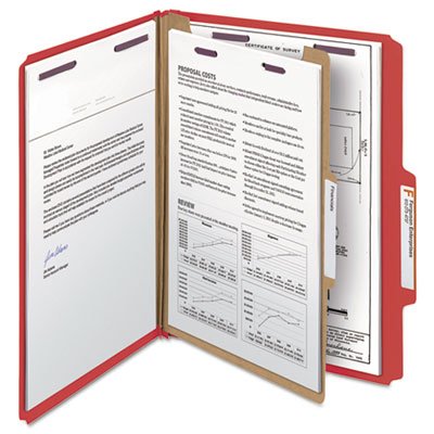 -. Title : Smead Products - Smead - Pressboard Classification Folders, Letter, 4-Section, Bright Red, 10/Box - Sold As 1 Box - SafeSHIELDTM coated fastener technology. - Feature colored 23 pt. pressboard covers with 2" prong fasteners inside front and back. - 1" capacity fasteners on both sides of 17 pt. brown Kraft dividers. - Matching color Tyvek gussets for 2" expansion. - 2/5 cut top tabs in right of center position.