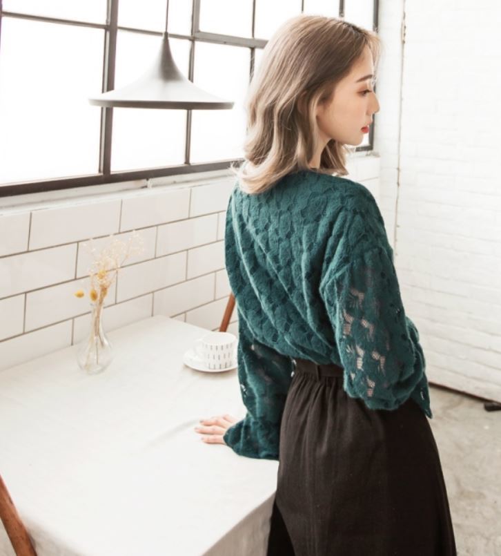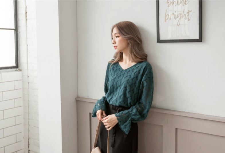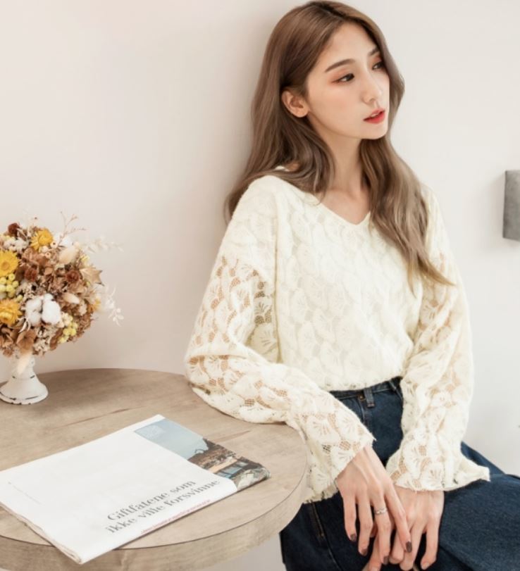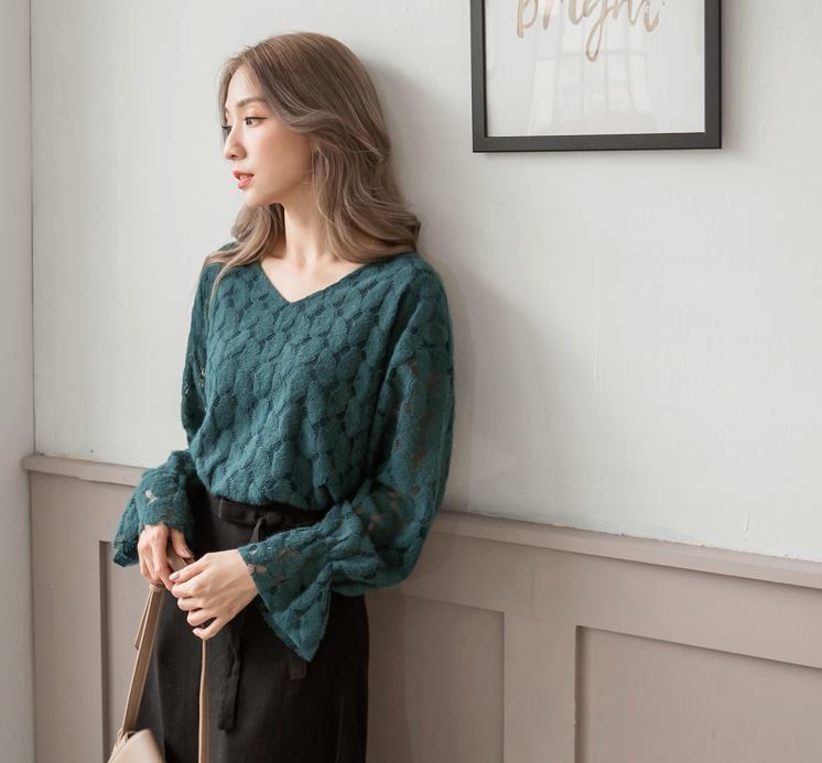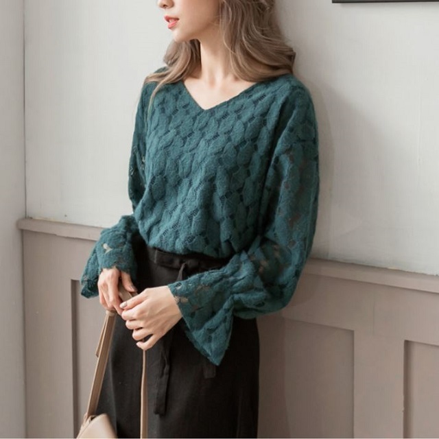 レース素材や袖口のフリルがガーリーなVネックブラウス♪