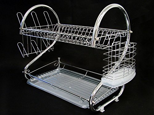 -. Feature : Condition: New Surface: Chrome 2 layer dish rack holds up to 17 plates or bowls Removable Side mounting mug stand and cutlery holder Constructed with heavy duty and rust-resistant chromed wire for stability and durability Lower flat surface accommodates glasses or mugs Removable draining tray allows easy removal of excess water Non-marring silicone coated feet protectors Assembles in minutes Package Includes: plastic draining tray, mug stand, and cutlery holder Overall Dimensions (L x W x H in inches): 21 x 9 1/2 x 15 1/4