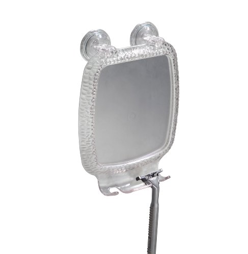 - Suction mirror designed for shaving in the bath or shower; includes 2 built-in hooks for razors