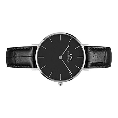 Stainless steel case with a black leather strap. Fixed stainless steel bezel. Black dial with silver-tone hands and index hour markers. Dial Type: Analog. Quartz movement. Scratch resistant mineral crystal. Pull / push crown. Solid case back. Case size: 32 mm. Case thickness: 6 mm. Round case shape. Band width: 14 mm. Tang clasp. Water resistant at 30 meters / 100 feet. Functions: hour, minute. Casual watch style. Daniel Wellington Classic Petite Reading Ladies Watch DW00100179.Feature