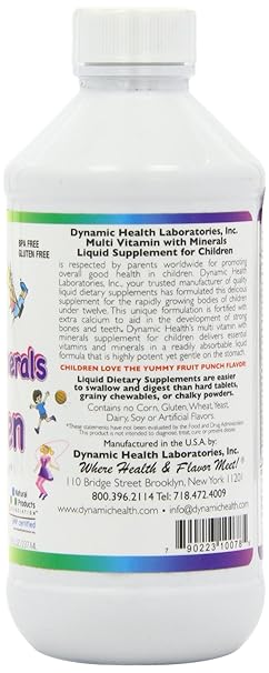 Dynamic Health Multi Vitamin with Mineral Liquid Supplement for Children is respected by parents worldwide for promoting overall good health in children. Dynamic Health has formulated this delicious Fruit Punch Flavor supplement for the rapidly growing bodies of children under twelve. This unique formulation is fortified with extra Calcium to aid in development of strong bones and teeth.This Liquid Multi-Vitamin for children delivers essential vitamin and minerals in readily absorbable liquid formula that is highly potent yet gentle on the stomach.