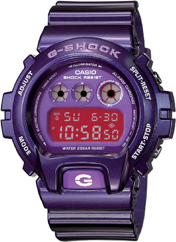 Ideal for the active, modern man who needs a timepiece that can stand up to tough conditions, the Casio Men's G-Shock Sport Watch features vibrant colors and a glossy finish for a modern look. Framed by a metallic purple resin bezel, the bright purple dial offers an alarm, stopwatch, countdown timer, 12- and 24-hour formats, and day, date, and month display with easy-to-use push buttons. Three sub-dials sit at the top of the dial and a rectangular digital dial displays the time in the lower half of the round watch face. An EL backlight ensures easy viewing night or day, and the durable purple resin band wraps comfortably around the wrist, fastening with an adjustable buckle clasp. Shock resistant for protection against strong impacts and shaking, this distinctive timepiece is also water resistant to 660 feet (200 meters).Feature