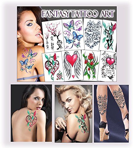 -. Feature : This package includes a gorgeous collection of 8 large size tattoos (7" tall) / 100% waterproof and very long lasting...for up to 5 days, even while swimming & bathing / Premium quality. Made in the USA. Safe for all skin types. / Easy to apply in 10 seconds with water, easy to remove with rubbing alcohol / Will apply to almost any surface: clothing, mirrors, cups, glasses and more