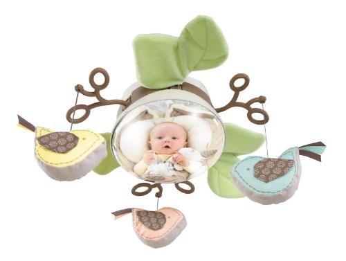 Motorized mobile with mirrored globe and overhead birdies will enhance baby's facial recognition