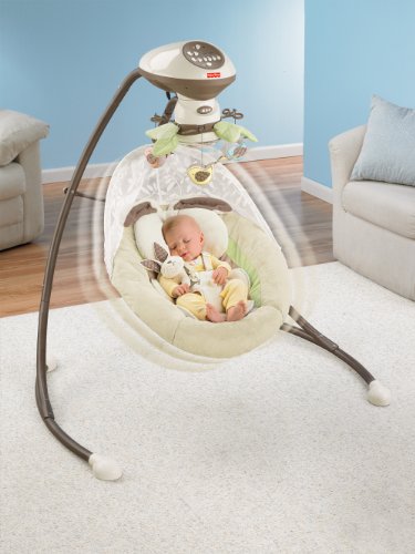 Fisher-Price My Little Snugabunny Cradle ‘n Swing cradles and swings, soothes and entertains, just the way baby likes it. How? By letting you choose and combine features baby likes best! Choose a seat position (recline or upright; left-facing, center, or right-facing), which determines the swinging motion (side-to-side cradle or head-to-toe swing), and choose a swing speed (1-6)?then, if it suits baby’s mood, add 16 soothing tunes, gentle nature sounds, and motion on the motorized mobile. Sot little birdies “fly” overhead to help soothe, entertain and stimulate baby’s developing senses, and a tethered plush bunny toy to snuggle offers soothing comfort and playtime fun!