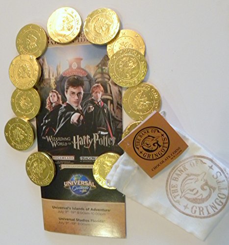-. Binding : Misc. -. Brand : Universal Studios -. EAN : 0799705366770 -. Feature : a closed little canvas bank bag containing 3. 0z approx 12 gold foil covered milk chocolate gringots stamped coins / Direct from univeral studios florida wizarding world of harry potter Diagon Alley / Picked up for you the day after you order to insure freshness / Allergy info: contains wheat & eggs & shares equipment with & produced in a facility that contains peanuts,tree nuts,milk,soy,egg & wheat / comes with first week commemorative guide map -. Label : universal -. Manufacturer : universal -. PackageQuantity : 1 -. ProductGroup : Grocery -. ProductTypeName : GROCERY -. Publisher : universal -. Studio : universal -. Title : Universal Studios Wizarding World of Harry Potter Diagon Alley Gringot Bank Milk Chocolate Coins Decorative Bag 3. Oz & Commemorative Opening Week Map Gift Set -. UPC : 799705366770