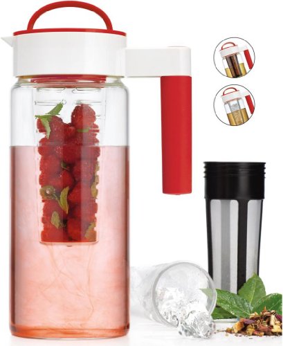 In the box: Pitcher with plastic air-tight lid and silicone handle, fruit infuser, brewing filter, ice chiller, all screws into the lid so it stays securely in place, Fruit Infuser and Tea Infuser makes it great for infusing water or alcohol with fresh fruit or tea naturally at home, Open slots in rod allow contents to combine with liquid.