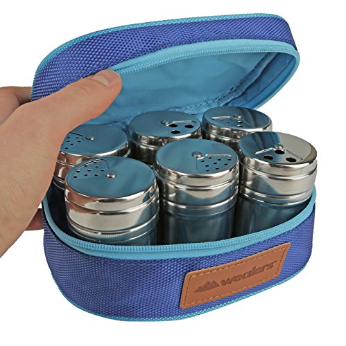 Portable Stainless Steel Spice Shaker Seasoning Dispenser - 6 Pc Set with Rotating Lids and Travel Bag| Spice Jars - Salt and Pepper Shakers - Dry Herb Spice Condiment Dispenser |Camping|Hiking|BBQ