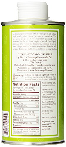 La Tourangelle Avocado Oil is processed on equipment like that used to process extra virgin olive oil. The avocado pulp is first expeller-pressed usually using a centrifuge. It is then lightly filtered and "polished" using another centrifuge. It takes 15 to 20 avocados to make 1 (one) 250 ml/8-ounce tin. Unopened: 24-month shelf life. Opened: best used within 12 months.