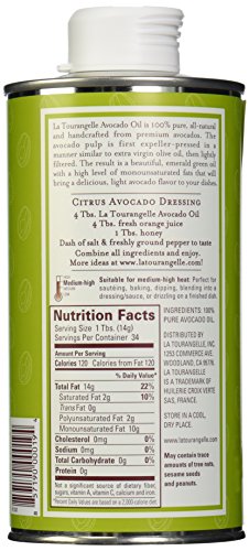 Avocado oil contains good fat--monounsaturated fat. Monounsaturated fat has a powerful effect on high cholesterol, weight, and belly fat making La Tourangelle Avocado Oil a great substitute for "bad" fats. La Tourangelle Avocado Oil confers important nutrients from the avocado pulp such as antioxidants, potassium and Vitamin A. Cooking, baking, dressing, dipping or moisturizing your skin and hair--La Tourangelle Avocado Oil can do it all!