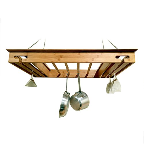 Solid Construction: The Entire Hanging Rack is Made from Solid Bamboo and Is Built to Hold Up to 40Lbs of Hanging Pots, Utensils, Glass Ware or Mugs. The Hanging Pot Rack Arrives with Hardware To Hang from a Ceiling up to 96"