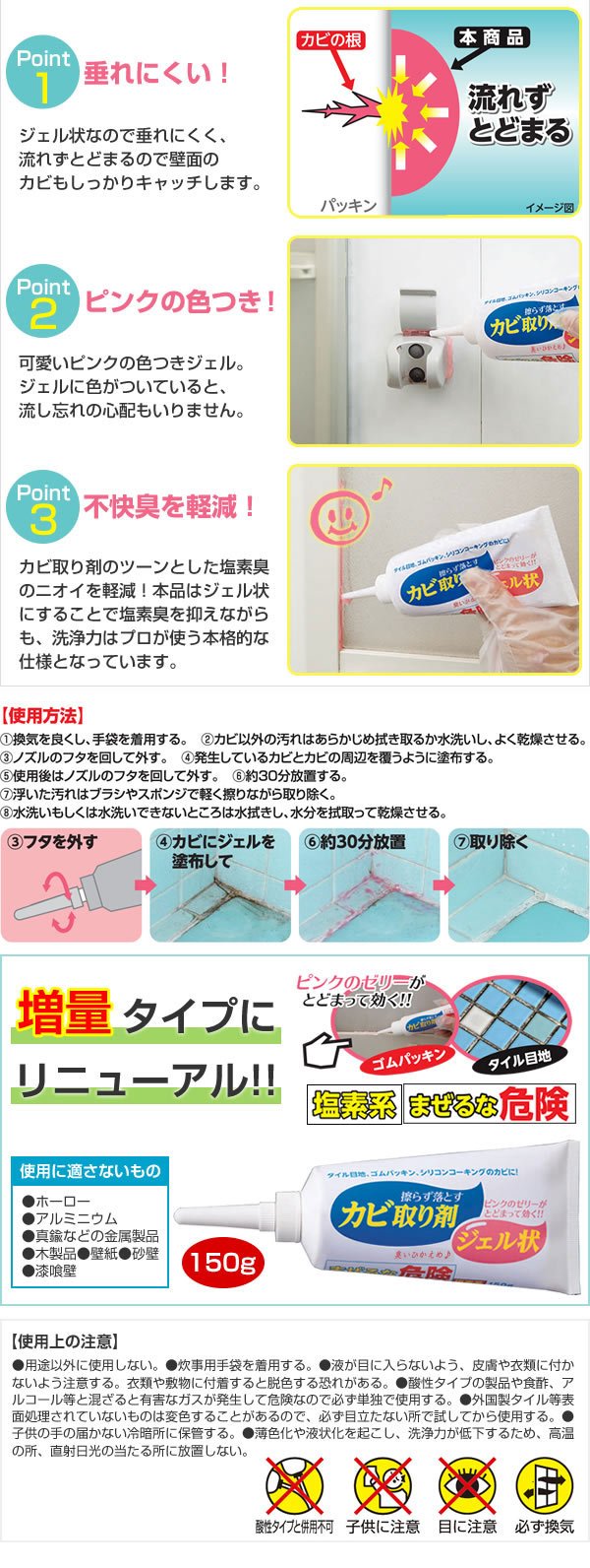 · Together with acidic type products, chlorine gas comes out and it is dangerous, so do not use it together.