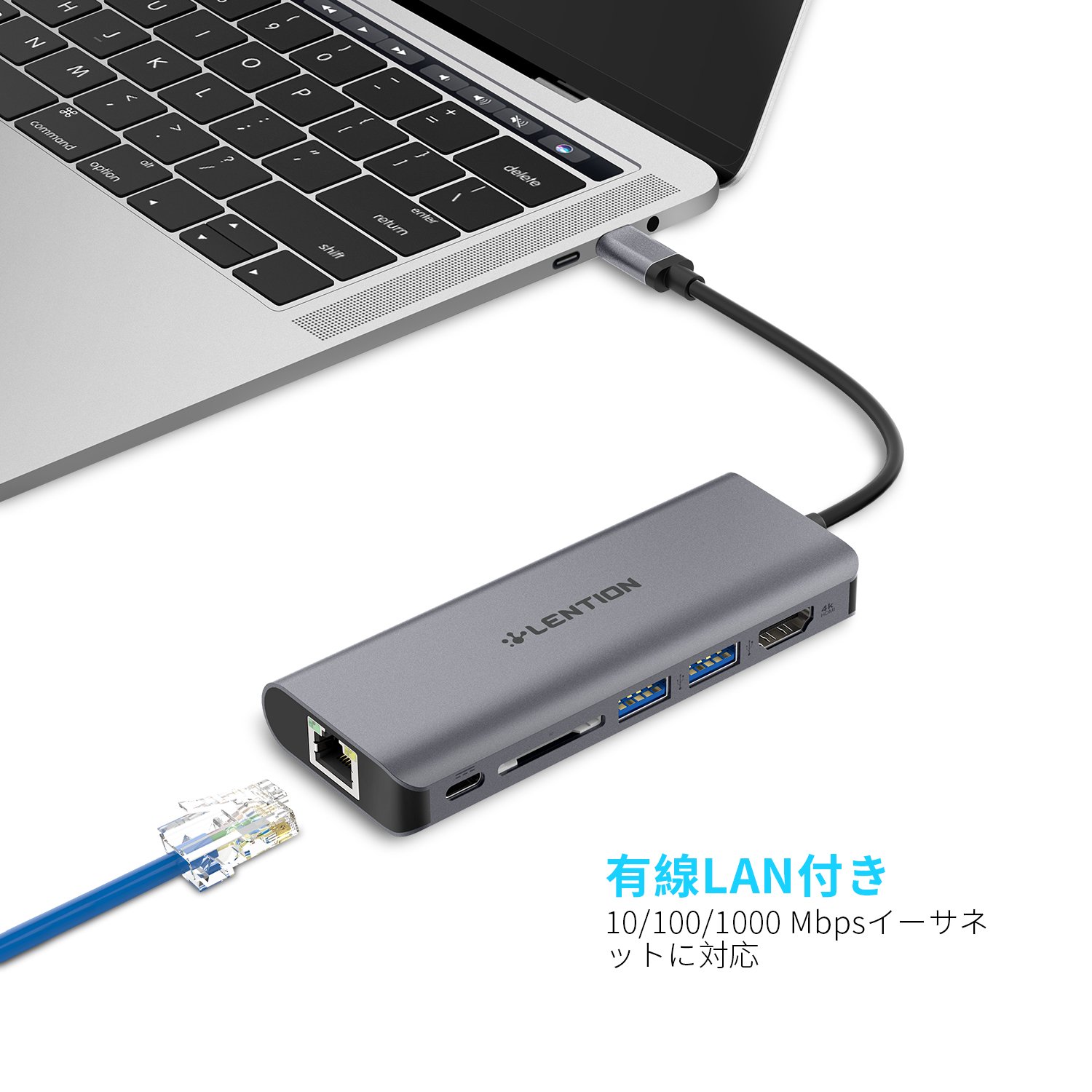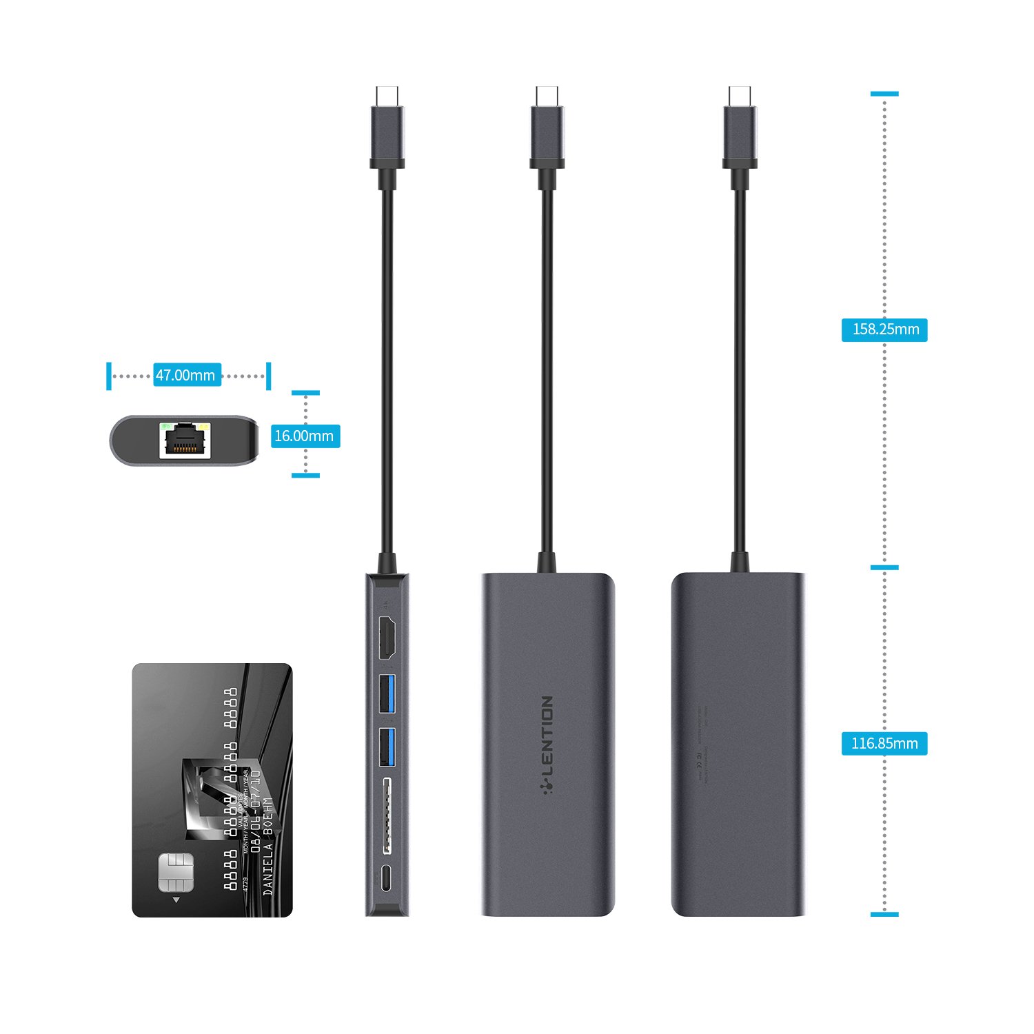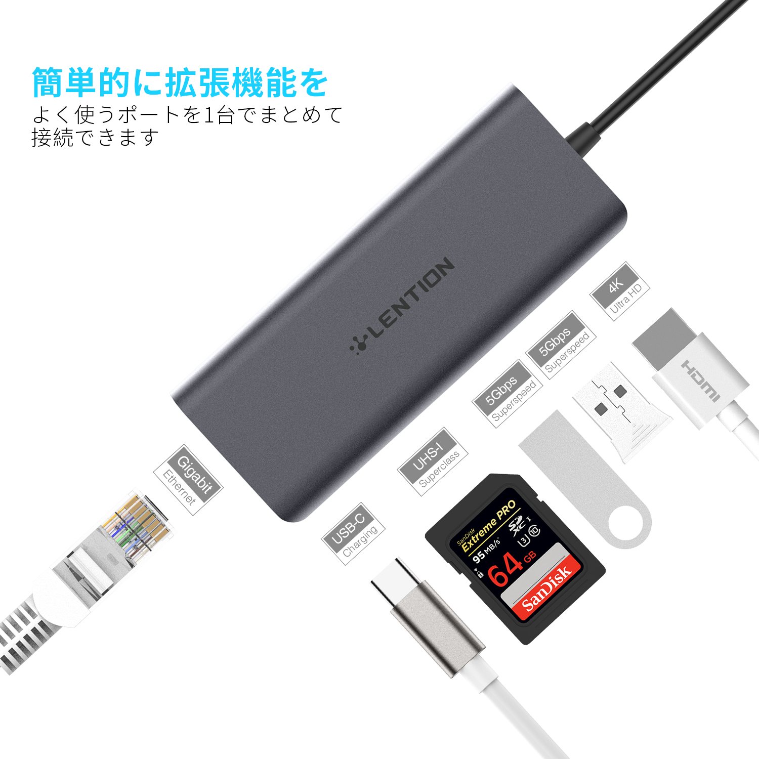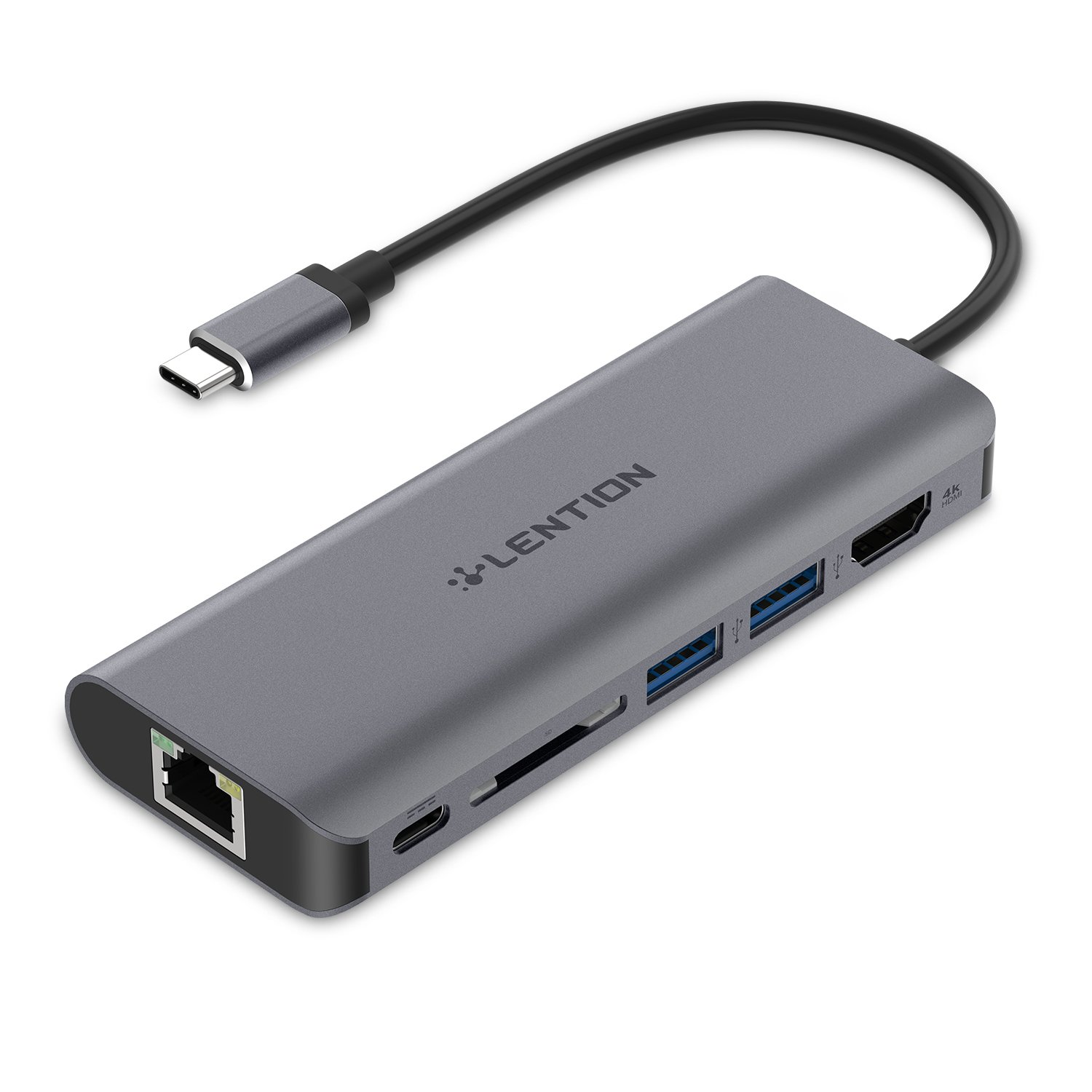 Connector shape: USB Type-C (female) × 1, USB 3.0 (female) × 2, SD slot × 1, HDMI (female) × 1, RJ-45 × 1