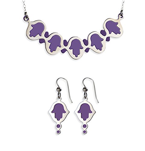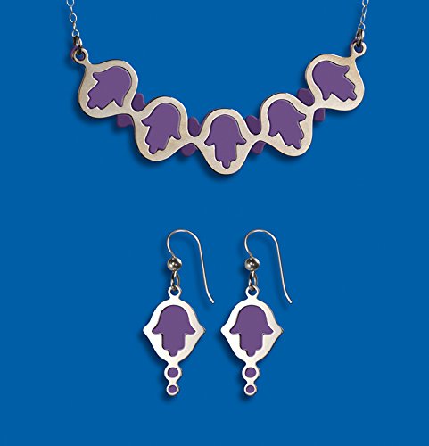 -. Feature : Pile on the luck with this fabulous sterling silver jewelry set of Hamsa charms. / The purple elements are made of anodized aluminum. / Give the matching necklace and earrings as a gift for any occasion. Items also available individually. / Made in the USA / Measurements: pendant - 2 1/2" x 1", necklace length - 18 1/2", earrings - 15/16" x 9/16".