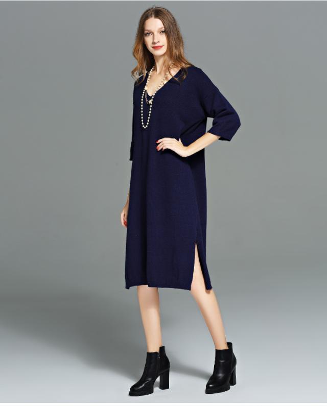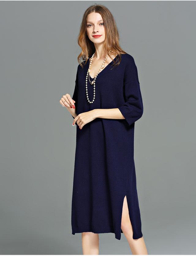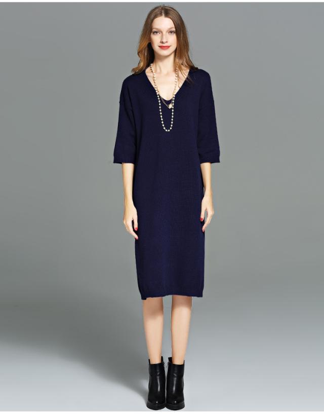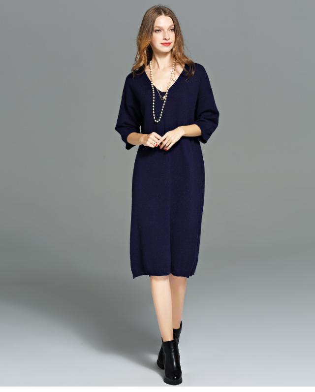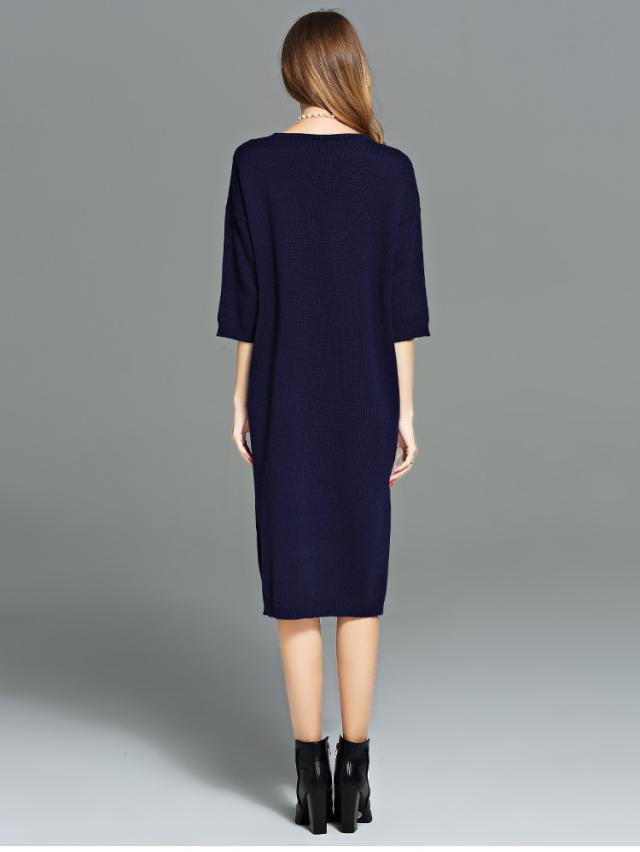 ニットワンピース ニット ?ネック 五分丈 袖あり 膝下 ロングワンピース ワンピース オフィス 通勤 結婚式 二次会 披露宴 パーティー デート 女子会 食事会 親族 入園式 大きいサイズ 2L 3L 4L 5L 6L ネイビー 20代 30代 40代
