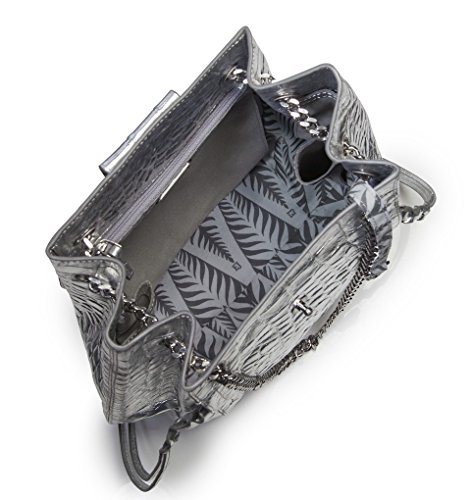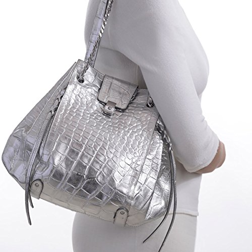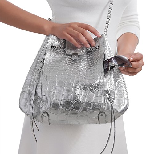 -. Feature : Dimensions: 12"L x 10"H x 5"W / Handle Drop: 19.50" / Color: Silver / Croc embossed leather mid-size bucket hobo is functional and sleek. Pull chain accordion construction opens wide to permit easy access / Top placket lock closure secures contents with a simple "click". Discreet hardware allows the richness of the polished leather to prevail