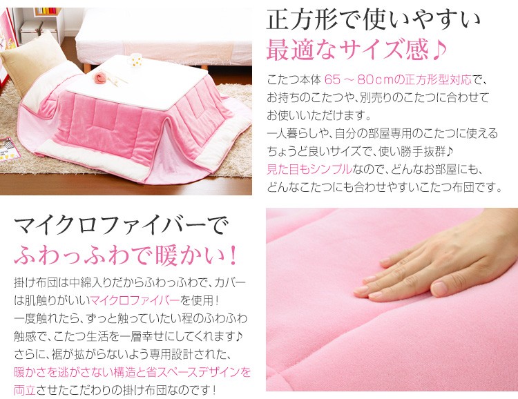 【商品について】マイクロファイバー使用!ピンクカラーの省スペースこたつ布団【幅65-80cm・正方形こたつ対応】(こたつ布団単品)■サイズ:外寸:(約)175x175cm※商品重量:(約)1.7kg■カラー:ピンク■素材:側生地(表地・裏地・詰め物):ポリエステル100%※洗濯可能(ネット使用)■その他:・完成品でのお届けです。(お届け時は圧縮された状態で届きます)・梱包サイズ:(約)45x45x18cm・梱包重量:(約)2.7kg