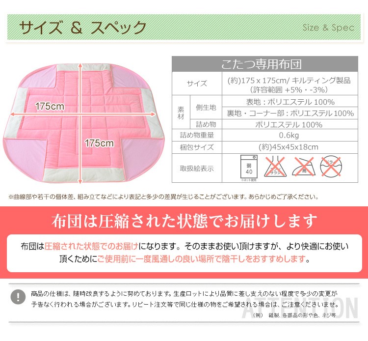 こたつ専用布団(ピンク)単品【正方形タイプ】(65~80cm幅対応)![]() こたつ専用布団(ブラウン/ベージュ)単品【正方形タイプ】(65~80cm幅対応)はこちら ![]() こたつ専用布団(ブラウン/ベージュ)単品【丸型タイプ】(直径75~85cm対応)はこちら ![]() |