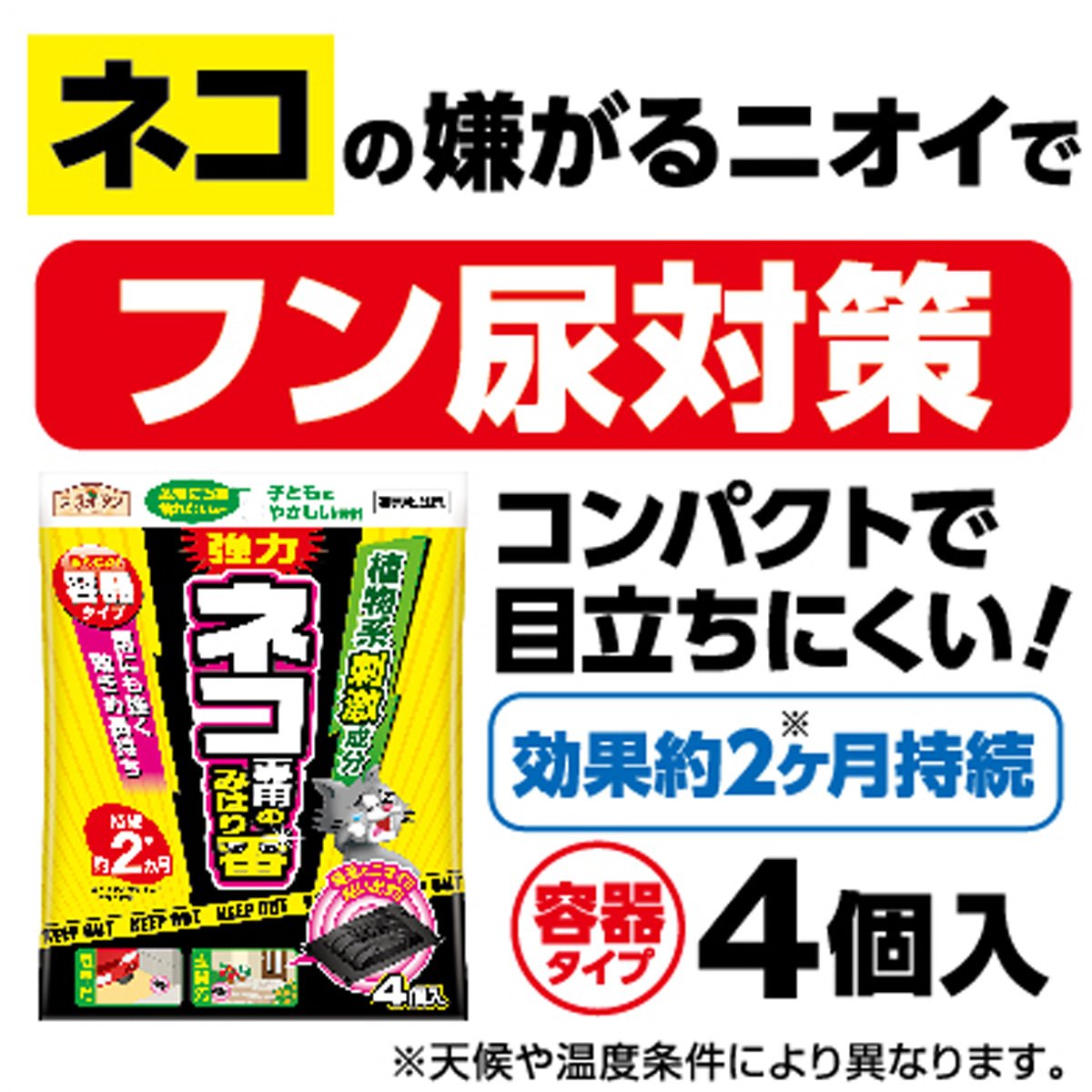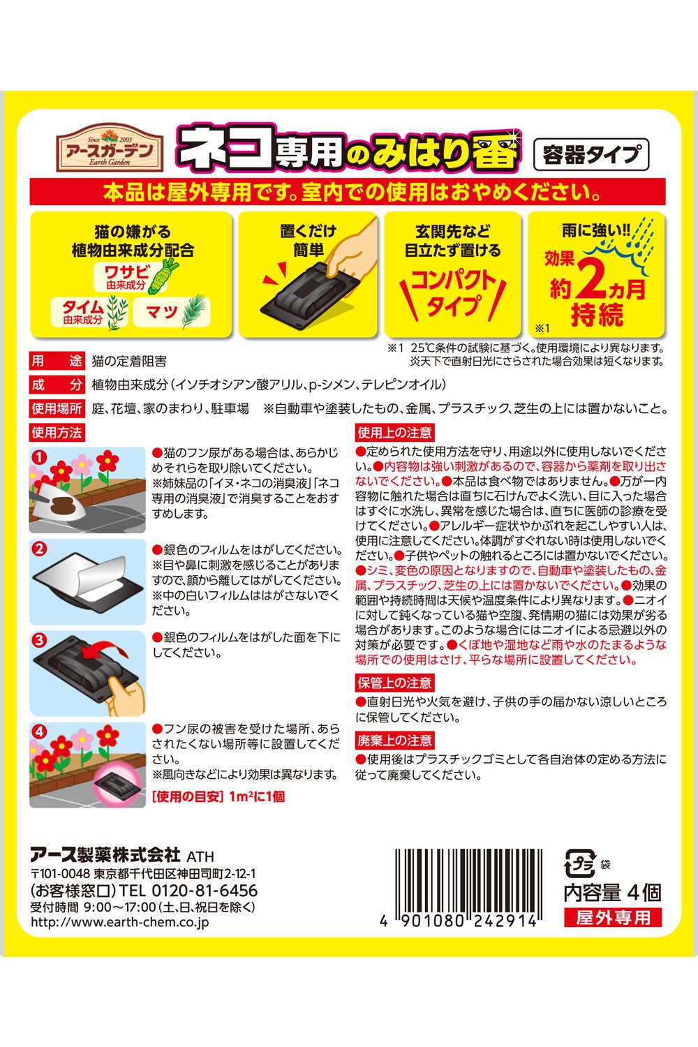 ● Combination of plant-derived ingredients disliked by cats: The effect of expelling cats for about 2 months with the combination of plant derived ingredients such as wasabi derived ingredients, time derived ingredients, pine, etc. will last.