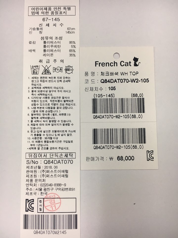 제조자 : 퍼스트어패럴