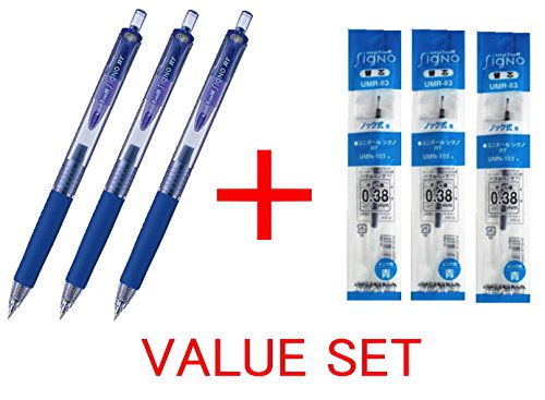 Uni-ball Signo RT Rubber Grip & Click Retractable Ultra Micro Point Gel Pens -0.38mm- Blue Ink-3 Pens & 3 Pens Refills - Value Set