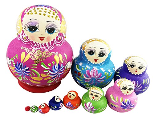 -. Feature : Use fushia as main color with colorful firework pattern on the middle / Add some gold glitter on the head and a gold piece on the middle to make it shiny / Mini and handhold doll set, the largest measures 11 cm/4.3" in height / Contains 10 dolls with decreasing size placed one inside the other to appear as one / Nesting dolls are children's great toy,wonderful decoration and awesome gift