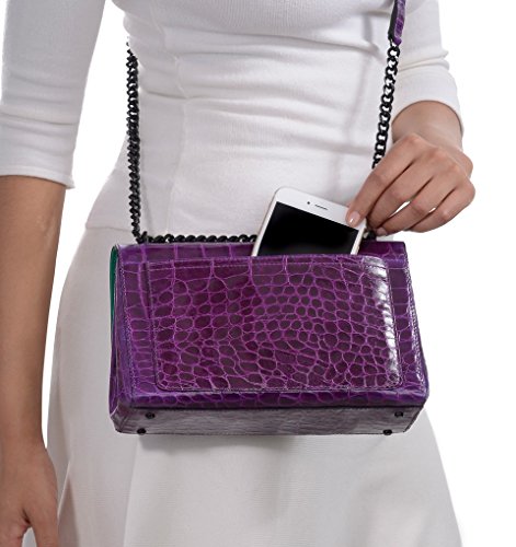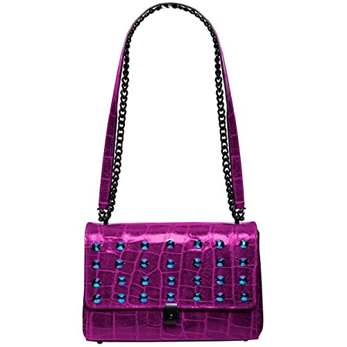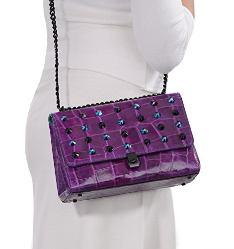Classic tailored bag made of croc embossed calf leather with rows of faceted Swarovski crystals punctuating the flap. Lock closure secures contents with a simple “click”.