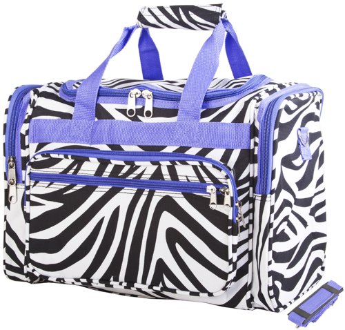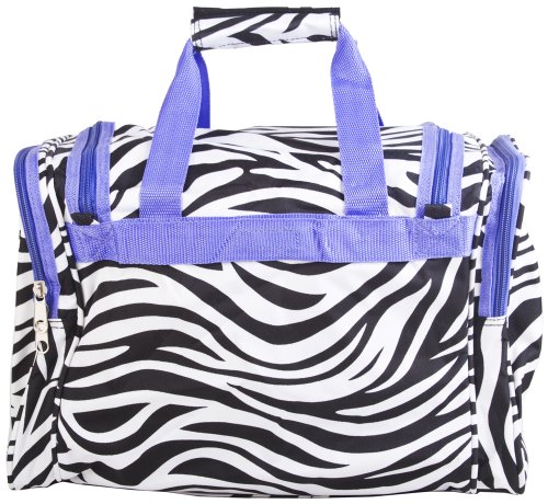 -. Brand : World Traveler -. ClothingSize : 16-inch -. Color : Zebra - Purple -. Department : womens -. EAN : 0763598168681 -. Feature : Adjustable, detachable non-slip padded shoulder strap / U-top opening provides easy access to roomy zipper secured main compartment / Metal feet allows stabiity to bag when setting down and provides bag floor not to touch floor directly to get dirty / Front exterior zip pocket with two exterior end zip pockets / Silver pewter hardware -. Model : 16-298 -. MPN : T16-163-PP-1 -. NumberOfItems : 1 -. PackageQuantity : 1 -. PartNumber : T16-163-PP-1 -. ProductGroup : Apparel -. ProductTypeName : LAGE -. Size : 16-inch -. Title : World Traveler Purple Zebra Duffle Bag 16-inch -. UPC : 763598168681