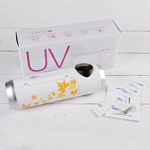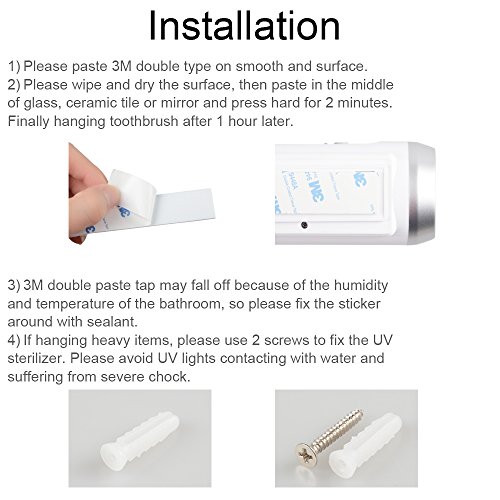 - 4. Two-way installation: A 3M double tape included to stick in the middle of glass, ceramic tile or mirror and 2 screws to fix the UV sterilizer if hanging heavy items.