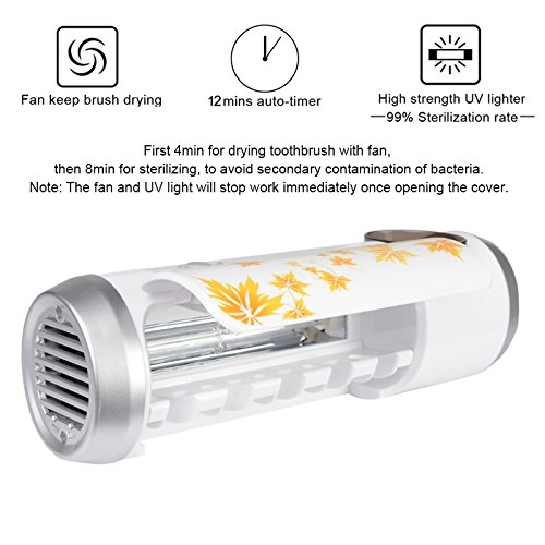 - 1. UV Light& Drying Fan:Mercury germicidal UV lights kill above 90% of germs&bacteria. And the dying fan can help to dry the toothbrush.