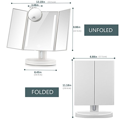 - CONFORM TO YOUR NEEDS ÿ With auto shut-off, touch sensors and 180 Degree free rotation mechanism, this trifold travel mirror conforms to all your needs. Its 10x magnifying round mirror is removable. Great for trips, vacations, and your purse. being done for 15 mins, it can automatically shut off, totally saving power.