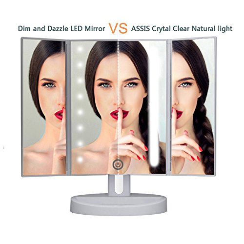 ASSIS Led Lighted Makeup Mirror with 10X Magnifying, Natural LED, Touch Screen and Auto Off Dual Power Supply, 180° Adjustable, Portable Compact Travel Trifold Vanity Mirror (White)
