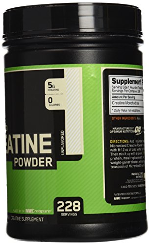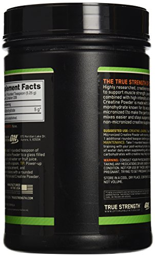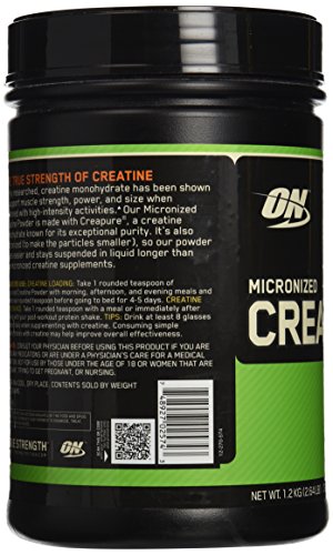 -. Binding : Health and Beauty -. Brand : Optimum Nutrition -. EAN : 0748927025743 -. Feature : Each serving supplies a full 5 grams (5000 mg) of 99 / Optimum Nutrition -. IsAdultProduct : 0 -. Label : Optimum Nutrition -. LegalDisclaimer : The information provided is intended for reference only. While we attempt to keep our information accurate, we cannot guarantee it is an accurate representation of the latest formulation of the product. If you have any concerns, please visit the vendor's web site. The information above are the views of the product's manufacturer, not the views of Stronger Nutrition LLC. These statements have not been evaluated by the Food and Drug Administration. This product is not intended to diagnose, treat, cure or prevent any disease. -. Manufacturer : Optimum Nutrition -. MPN : 2730079 -. NumberOfItems : 1 -. PackageQuantity : 24 -. PartNumber : 2730079 -. ProductGroup : Health and Beauty -. ProductTypeName : HEALTH_PERSONAL_CARE -. Publisher : Optimum Nutrition -. Size : 1200 -. Studio : Optimum Nutrition -. Title : Optimum Nutrition Micronized Creatine Powder -- 1200 g -. UPC : 748927025743