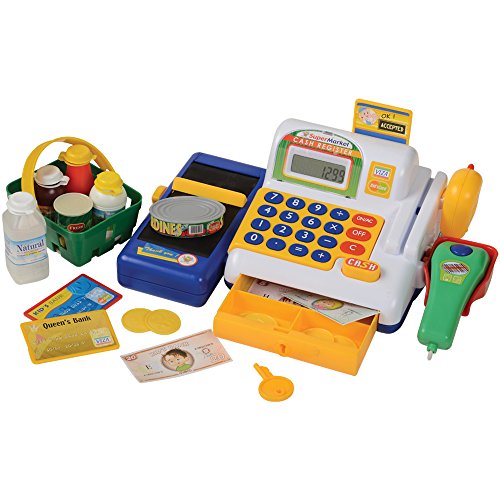 -. Feature : LANE 1 OPEN!: Your little one will have a blast being the clerk of their own supermarket. Scan groceries with the beeping scanner, total the bill on the working calculator and pay with included money and credit cards. / IMAGINATIVE PLAY: Encourage creativity, build fine motor skills, and stimulate narrative play with this super cool Supermarket Cash Register. Whether buying groceries or ringing up customers, our set has everything your little one needs for the ultimate pretend play. / WORKING REGISTER: This cash register is great for little hands with large buttons for calculating prices and even makes a "cha-ching" sound when opening the register. Run one of the credit cards to hear a sound letting your child know it was successfully swiped. / SAFETY FIRST: Toy safety is very important for CP Toys. That's why we test all our children's toys to ensure quality, safety and durability. The toys we sell are in full compliance with all U.S. safety laws, as we want to ensure the children using our toys are kept safe! / PRODUCT SPECIFICATIONS: Package includes: (1) register with scanner and conveyor belt, (1) basket (1) bottle of water, (1) can of sardines, (1) fruit cocktail, (1) ketchup, (1) milk, (1) chocolate milk, (1) key, (6) coins (2) credit cards, (3) paper money, (2) "AA" batteries. Product measures 12¾" L. x 7½" D. x 4½" H. Great for ages 3 and up.