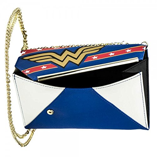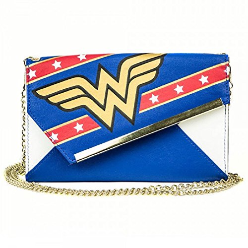 DC Comics Wonder Woman Envelope Wallet With Chain. Design features a blue & white hand held purse with Wonder Woman logo and a detachable gold chain to turn wallet into a purse.