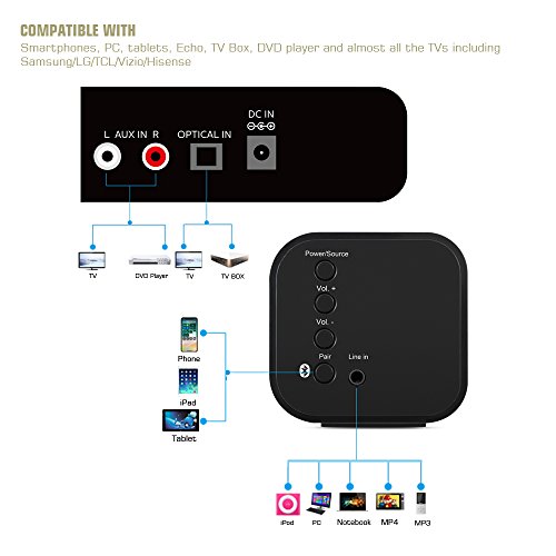 Wired and Wireless Connections: With advanced Bluetooth 4.0 technology, you can sync it to your phones, tablets and other Bluetooth devices quickly and flawlessly from 26 feet away without obstacles. The line in/RCA/optical inputs make wired connections allowed with a line in cable, RCA cables, 3.5mm to RCA cables or optical cable to enhance better sound quality whenever.