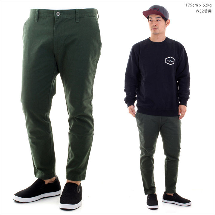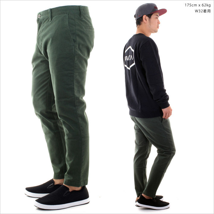 トレンドのアンクル丈がストリート好印象なチノパン。 膝下からテーパードがかかり、もたつきのない裾周りでフォーマルなジャケットスタイルにも合わせやすい一本。 ウエストや太ももは程良く余裕があり、ストレッチの効いた素材でスリムなパンツが苦手な方でもストレスなく着用ができます。 もう一織りして、ソックスをチラ見せするアクセントの効いたスタイリングも楽しめ、コーディネートの幅を広げてくれるオススメアイテムです。