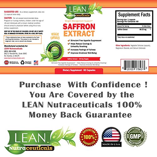-. Feature : EAT LESS & LOSE WEIGHT OR YOUR MONEY BACK!! -If you don't see results (or aren't COMPLETELY happy for any reason) by suppressing those late night snacking cravings or by curbing your sugar intake, you get ALL your money back! / MOST EFFECTIVE ON AMAZON (Compare our reviews) -Our 100% Natural, Pure 88.25mg formula produces REAL weight loss results. Stop battling with depriving diets, crazy workouts, or "Magic Pills"...Saffron is your REAL answer! / ULTRA-POWERFUL FORMULA FOR REAL RESULTS -Our proven formula contains EXACTLY what you need to make it WORK! No dangerous stimulants or other harmful ingredients. / SAFE & IMMEDIATE RESULTS -Our safe (no dangerous ingredients), proven (read our feedback), expert recommended (look online), and natural (100% pure) product produces REAL results for REAL people with NO side effects in as few as just 2 days! / A SMARTER WAY TO LOSE WEIGHT -We all battle cravings either at meals or in between. Having our 100% Pure Saffron Extract is your ticket to beating those cravings! Losing weight and becoming healthy starts with your diet, get back on track NOW! ORDER 2 OR MORE AND GET FREE SHIPPING!