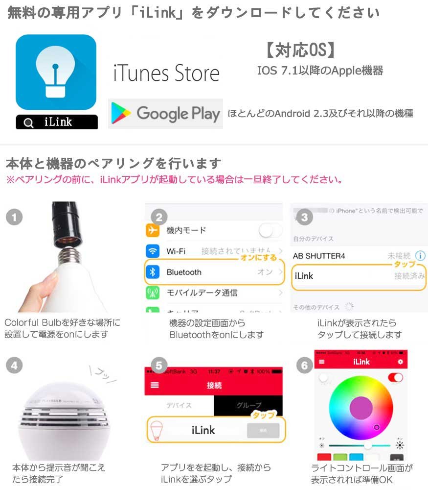 The bluetooth setting screen of the smartphone indicates that iLink connected iLink APP has been connected.
