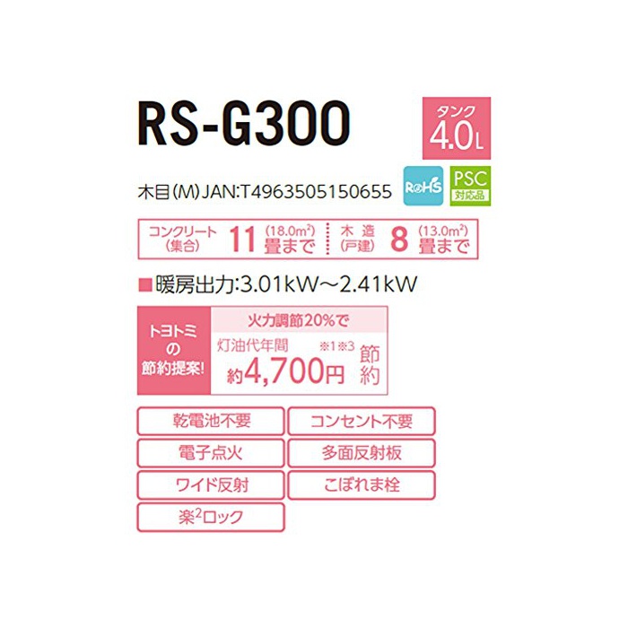 TOYOTOMI 석유 스토브(수동식 발전 건전지 불요) 【한패지 않겠 Pa】 「콘크리트11다다미/목조8다다미」 일본제 나무결 RS-G300(M)